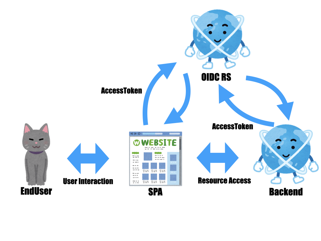 - RP(Client): IdPとは疎結合になっているWebアプリで、認証状態はSPA単体で管理